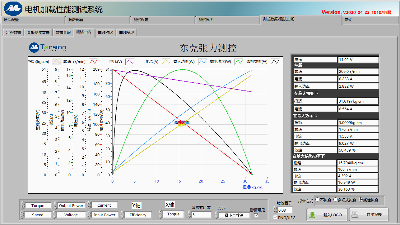 •自動測試方式:即負載根據設置自動加載,掃描出電機從空載到堵轉(或設定值)的特征曲線。因為電機在零載到相應負載和相應負載到空載這個過程中,下降曲線和回升曲線是存在相應誤差,系統可以通過下降曲線和回升曲線計算擬合出電機最真實的曲線,所以此界面就是最好的測試方式。