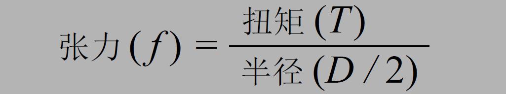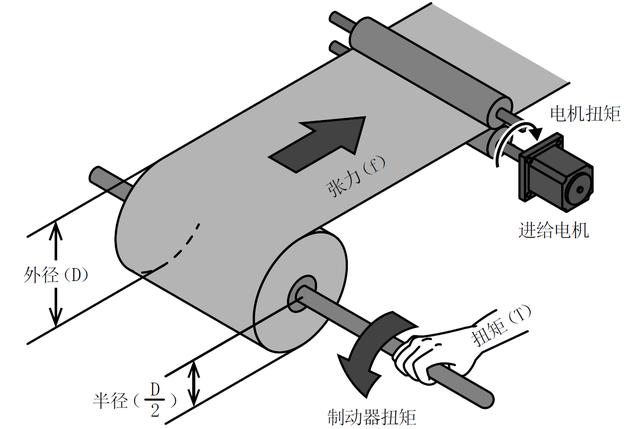 下面說明放卷長形材料時(shí)的張力和扭矩的關(guān)系。扭矩是作用于旋轉(zhuǎn)軸的力。放卷長形材料時(shí),卷軸的制動(dòng)扭矩(制動(dòng)器扭矩)比電機(jī)扭矩更弱,所以材料被向右側(cè)放卷。此時(shí),材料所受到的張力(f) 由較弱一側(cè)的制動(dòng)扭矩(T)決定, 扭矩(T) 和張力(f)的關(guān)系如下公式所示: