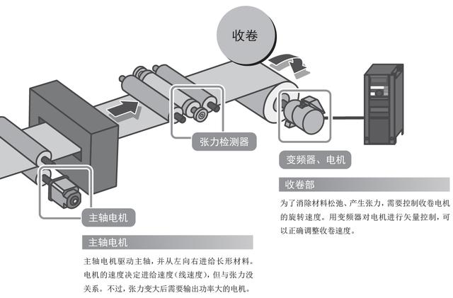 為了消除材料松弛、產(chǎn)生張力,需要控制收卷電機(jī)的旋轉(zhuǎn)速度。用變頻器對電機(jī)進(jìn)行矢量控制,可以正確調(diào)整收卷速度。